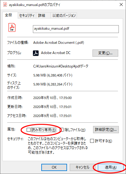 ②全般タブの読み取り専用にチェックを入れて適用をクリック